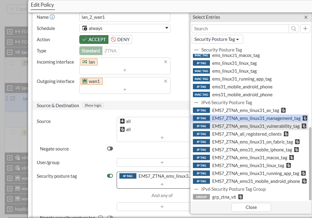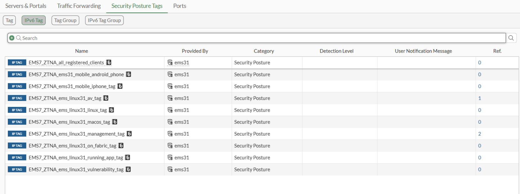 Go to Policy & Objects > ZTNA > Security Posture Tags > IPv6 Tag to verify that FortiGate has IPv6 tags from FortiClient EMS: