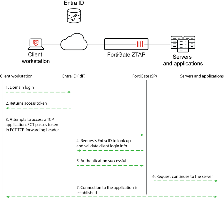 In this enhancement, Windows users signed in to their workstations using Microsoft Entra ID domain are automatically allowed access to ZTNA-protected TCP resources by using the same IdP login information. FortiGate queries Entra ID using the client’s login token to look up and validate the user. This allows single sign-on (SSO) and eliminates the extra step for each user to authenticate when they access a TCP application.