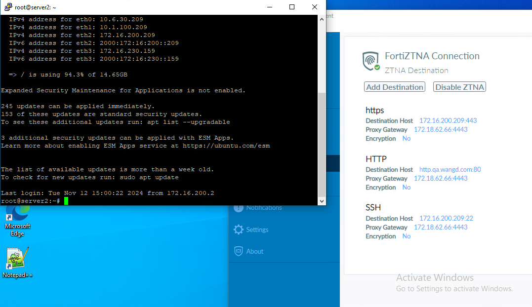 From the FortiGate, go to Log & Report > ZTNA Traffic to view corresponding traffic logs. Alternatively, use the CLI to run:
