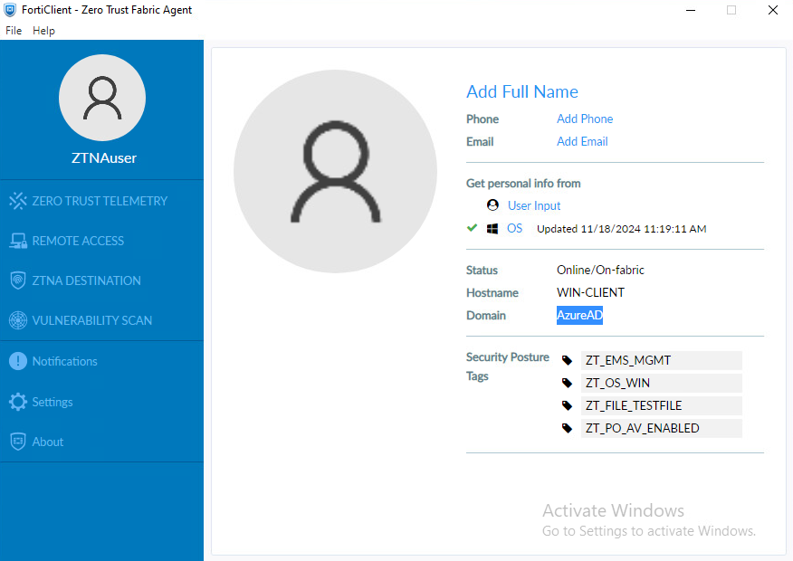 Once logged in and FortiClient is registered to EMS, click the user avatar to display information about the user, including the login domain name.