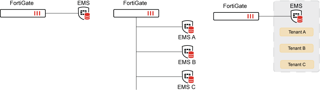 Multi-tenancy gives administrators the flexibility to deploy a single FortiGate with access to multiple FortiClient EMS servers, or a single FortiClient EMS with multiple tenants. The FortiGate can support up to seven EMS servers in a single VDOM. When multi-VDOM is enabled on the FortiGate, each VDOM can override the global EMS configurations to connect to their own EMS servers.