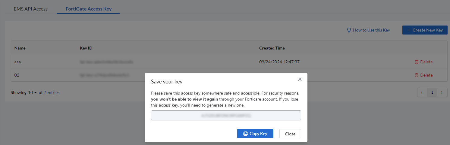 Click Access Key and switch to the FortiGate Access Key tab.