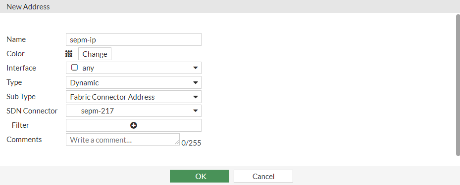 For example, you can create a dynamic Fabric Connector IP address subtype and use it in firewall policies as the source address. The dynamic IP address contains all IP addresses sent by SEPM.