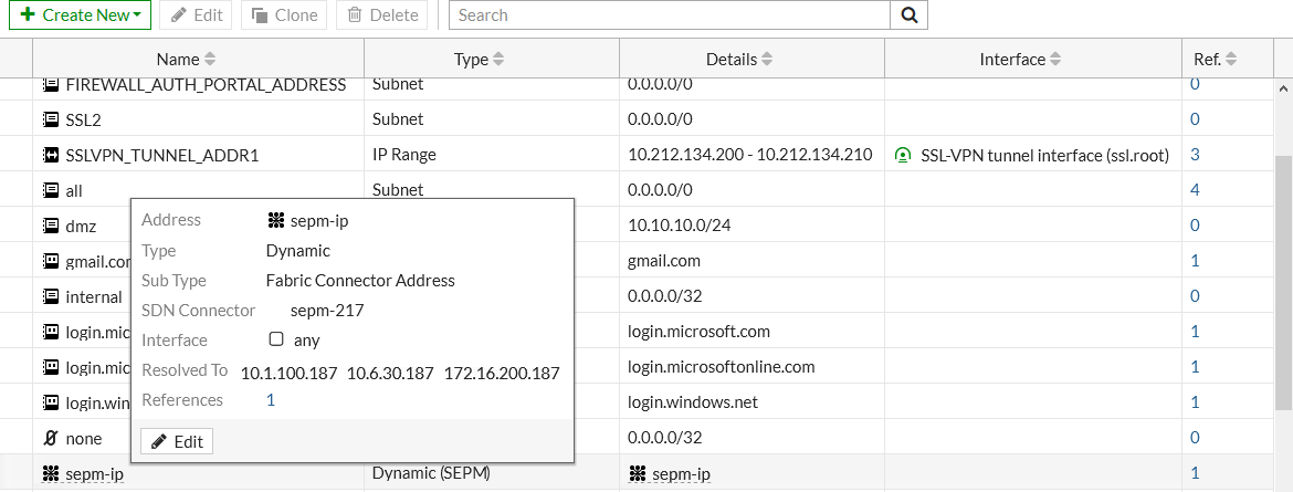 config firewall address edit "sepm-ip" set type dynamic set sdn "sepm-217" set filter "ComputerName=win10-1" config list edit "10.1.100.187" next edit "10.6.30.187" next edit "172.16.200.187" next end next end - Add the dynamic IP address to the firewall policy: