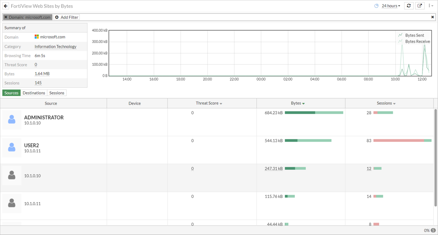 The FortiView Web Sites by Bytes monitor shows a list of visited websites. Double click a specific domain (or manually create a filter), such as microsoft.com, to see a breakdown of the usernames and IP addresses that visited that domain. See Monitors and widgets for more information.