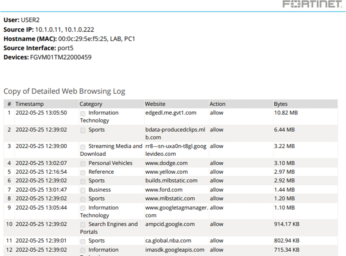 The User Detailed Browsing Log report require a username or IP address to run. If a username is used, the report includes logs related to that user regardless of their IP address. For example, the following report show two source IP addresses: