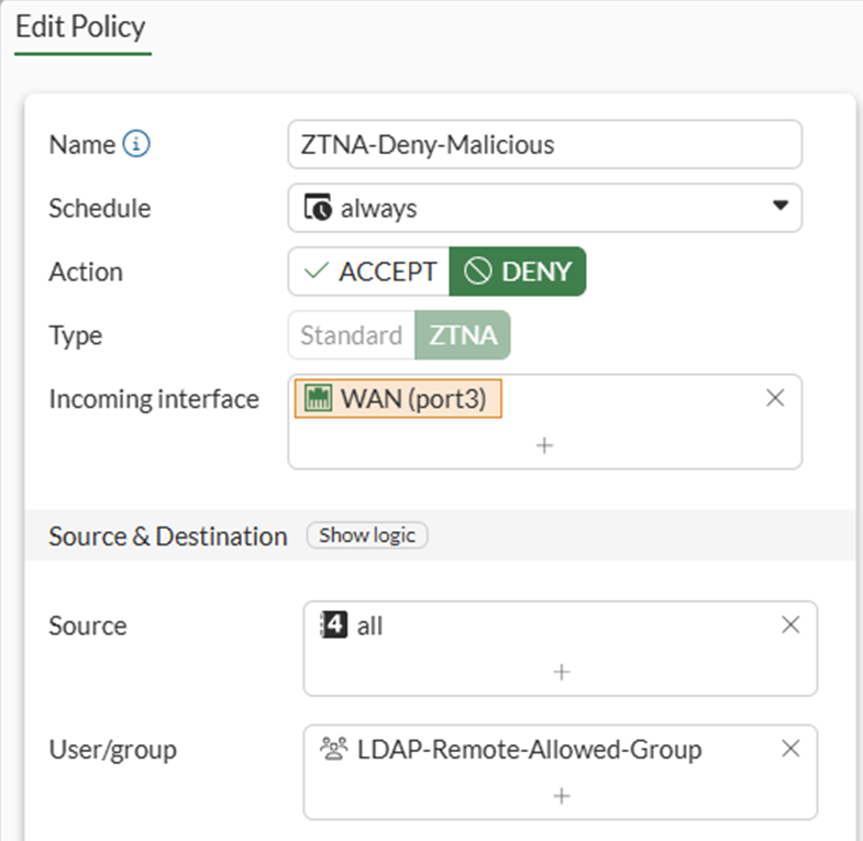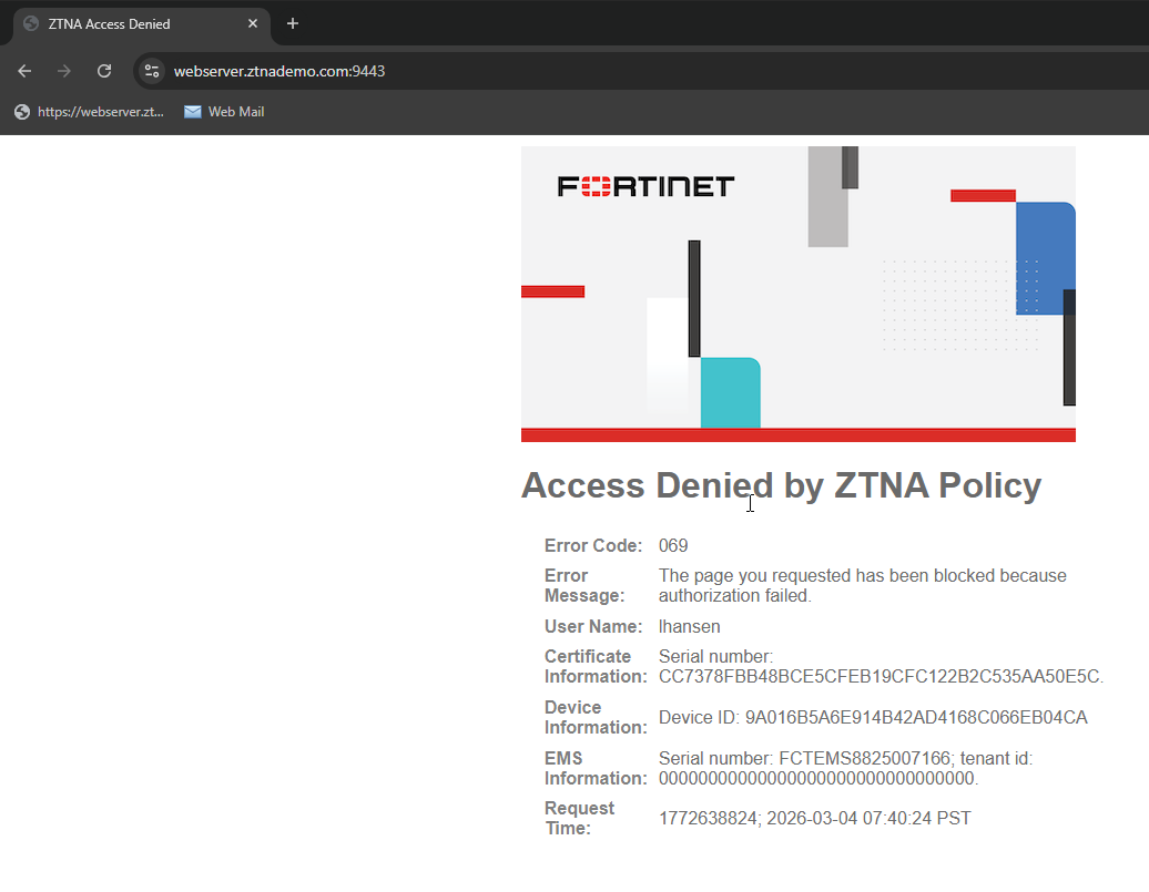1: date=2026-03-04 time=07:41:25 eventtime=1772638885574732337 tz="-0800" logid="0005000024" type="traffic" subtype="ztna" level="notice" vd="root" srcip=10.0.3.2 srcport=1355 srcintf="port3" srcintfrole="wan" dstcountry="Reserved" srccountry="Reserved" dstip=10.0.3.10 dstport=9443 dstintf="root" dstintfrole="undefined" sessionid=22618 srcuuid="b458a65a-f759-51ea-d7df-ef2e750026d1" dstuuid="01b612e6-174a-51f1-1a3d-b3293e8efa12" service="tcp/9443" proxyapptype="ztna-proxy" proto=6 action="deny" policyid=0 policytype="proxy-policy" appcat="unscanned" duration=61 user="lhansen" authserver="LDAP-fortiad" vip="WebServer:9443" vipincomingip=10.0.3.10 clientdeviceid="9A016B5A6E914B42AD4168C066EB04CA" clientdevicemanageable="manageable" clientdeviceems="FCTEMS8825007166" clientdevicetags="CLASS_Low/all_registered_clients" clientcert="yes" emsconnection="online" wanin=0 rcvdbyte=0 wanout=0 lanin=3866 sentbyte=3866 lanout=39507 fctuid="9A016B5A6E914B42AD4168C066EB04CA" msg="Traffic denied because failed to match a policy or proxy-policy" crscore=30 craction=131072 crlevel="high"
