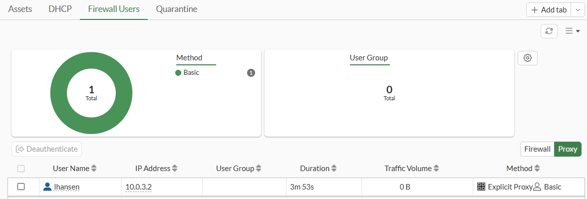 Go to Dashboard > Assets & Identities > Firewall Users and select the Proxy table. Confirm that user lhansen is listed, but no applicable user group is returned.