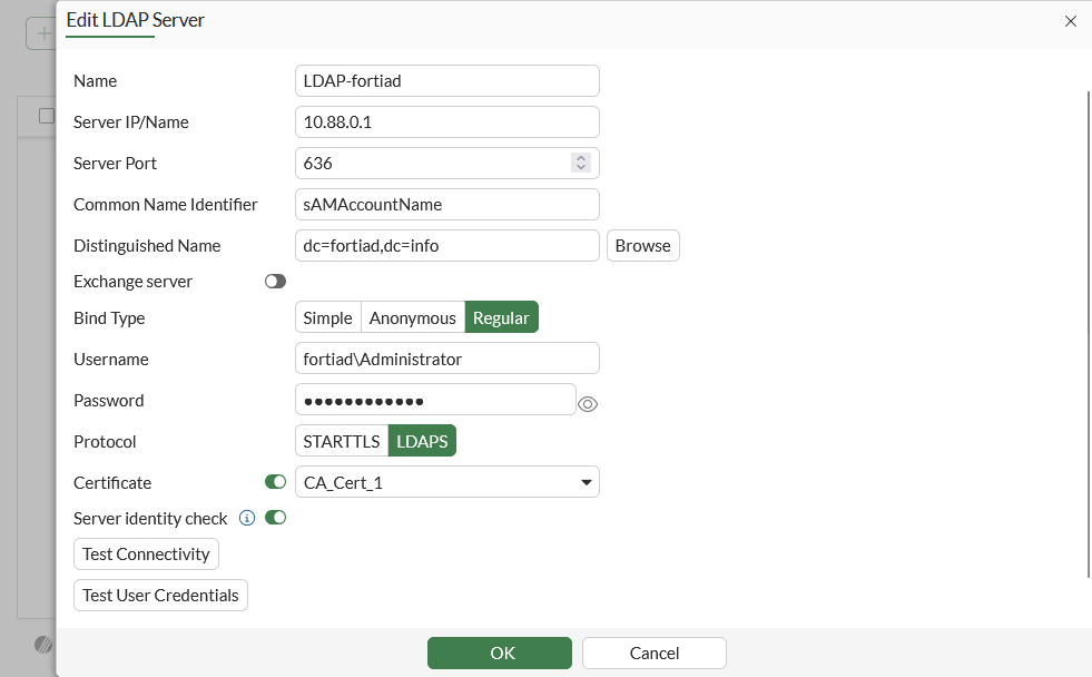 5. Set User database to Other and select LDAP-fortiad as the LDAP server.