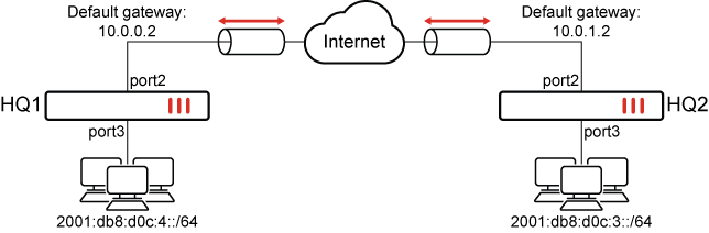 HQ1 port2 IPv4 address is 10.0.0.1 and port3 IPv6 address is 2001:db8:d0c:4::e.