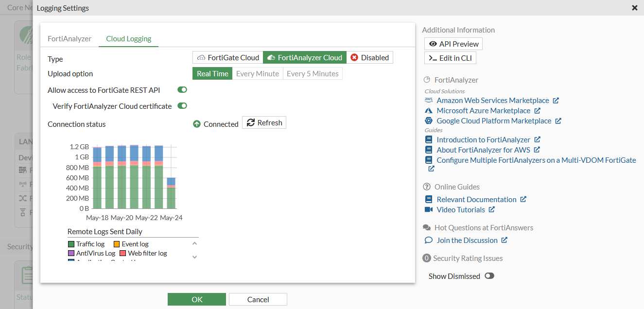Go to the FortiAnalyzer or Cloud Logging tabs to view the Remote Logs Sent Daily chart. FortiAnalyzer Cloud is used in this example.