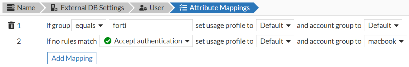Enter any Attribute Mappings required for the server and then map them to the usage profile you require and also set the account group. Click Add Mapping to configure the rules for the policy.
