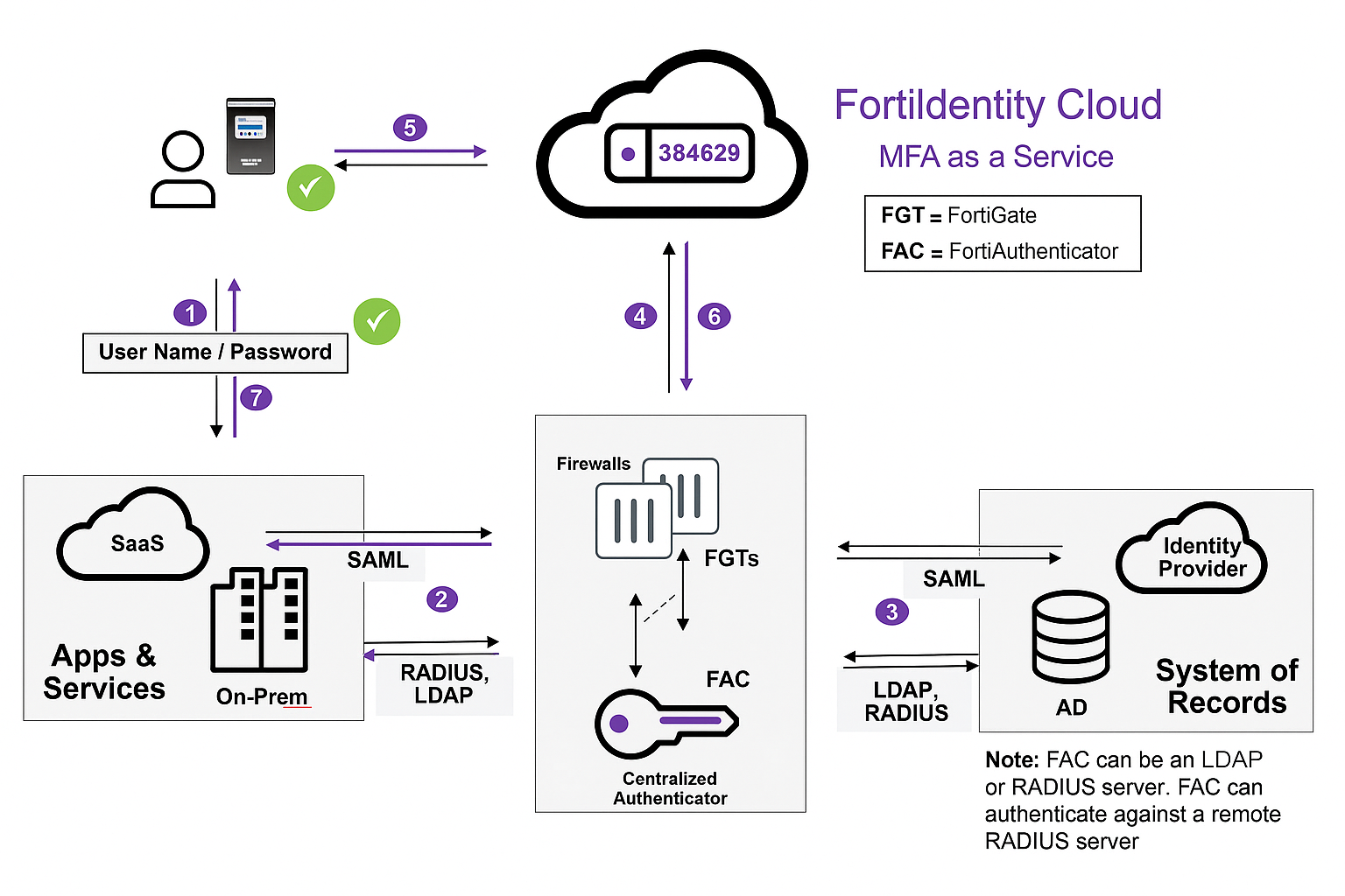 The Fortinet devices will then consult the connected system of records (e.g., SAML, LDAP, or RADIUS servers) to verify the credentials.