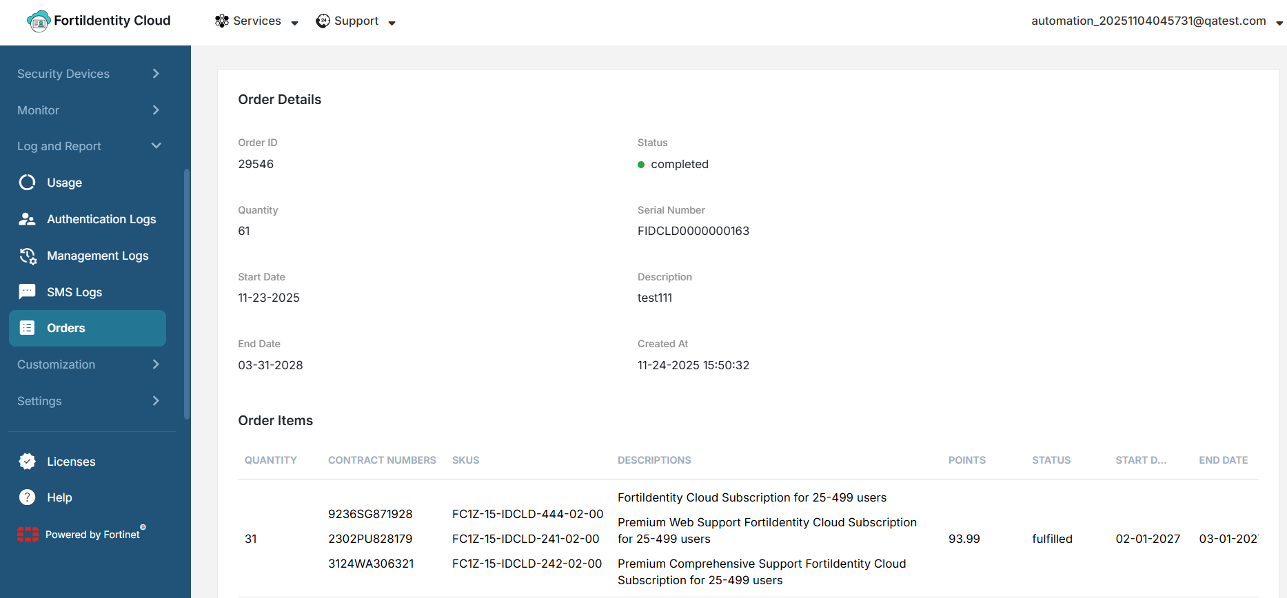 The Log and Report > Orders page shows logs of all the purchase orders that you have placed in FIC. It shows the following information: