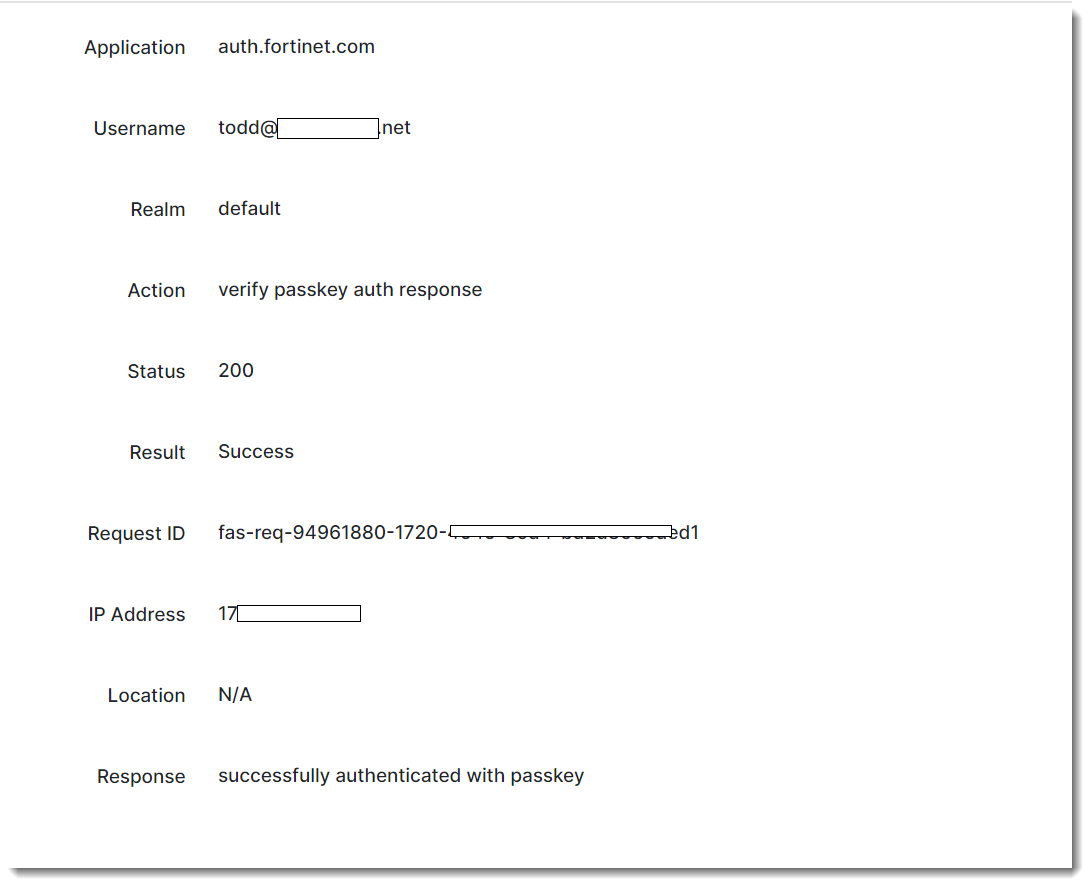 - After successful authentication with the external identity provider in his computer for a configured service provider, the user (Todd in this case) will be presented with the auth.fortinet.com page from FIC for MFA. Choose Login with Registered Passkey.