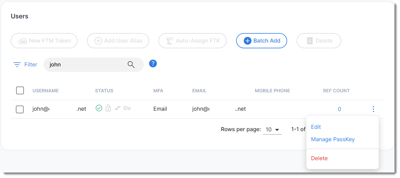 - Bob launches FIC, navigates to User Management >Users, locates John, and clicks the tool icon and selects Manage Passkeys.