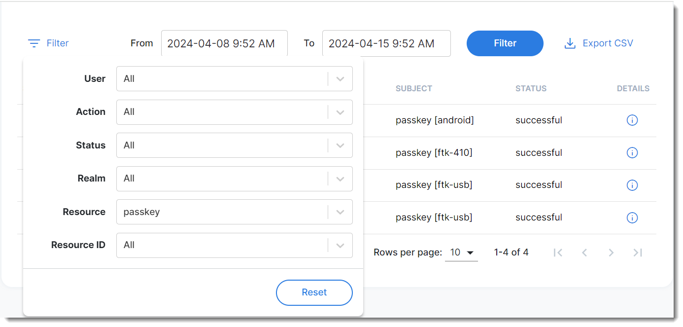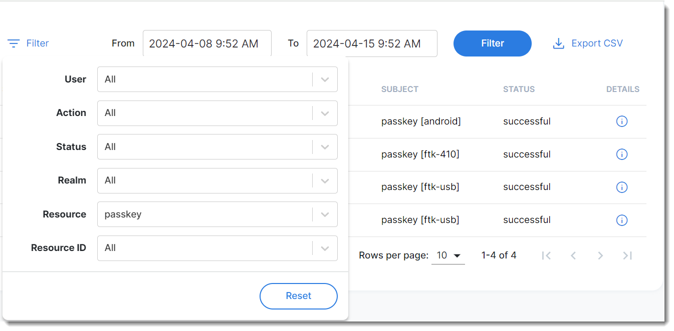 - Navigate to Log and Report > Management Logs, click Filter, and select Passkey in the Resource field.