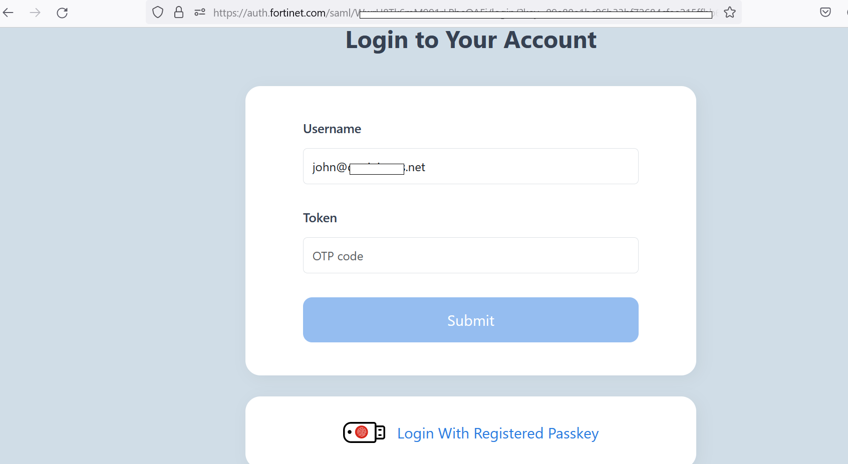 - After successful authentication with the external identity provider to access a service provider, John is presented with the auth.fortinet.com page from FIC for MFA. John then needs to choose Login with Registered Passkey.