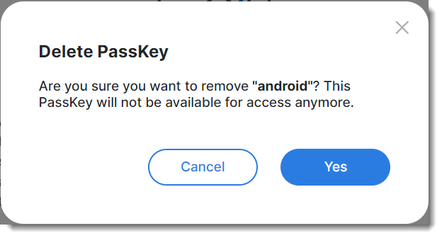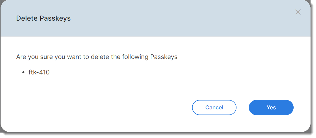 - Navigate to Security Devices > Passkey, select the passkey, and click Delete.
