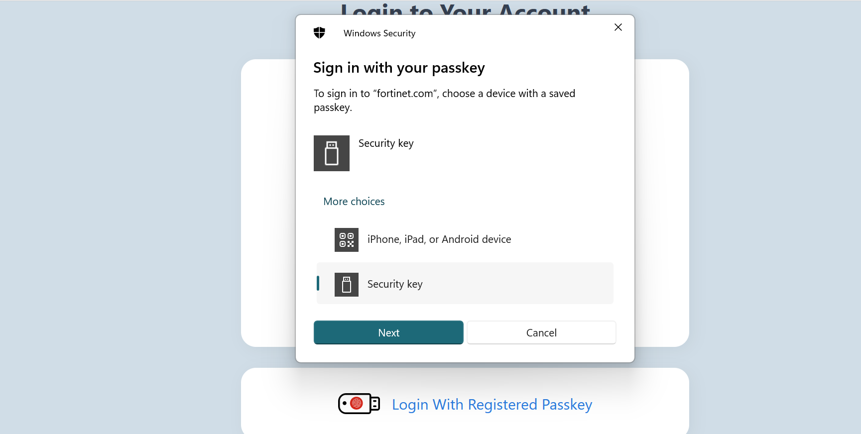 - Choose Security Key in the Wprompt,