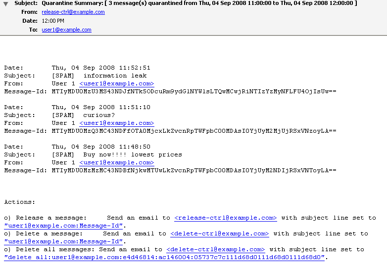 Subject: Quarantine Summary: [ 3 message(s) quarantined from Thu, 04 Sep 2008 11:00:00 to Thu, 04 Sep 2008 12:00:00 ] From: release-ctrl@example.com Date: Thu, 04 Sep 2008 12:00:00 To: user1@example.com |