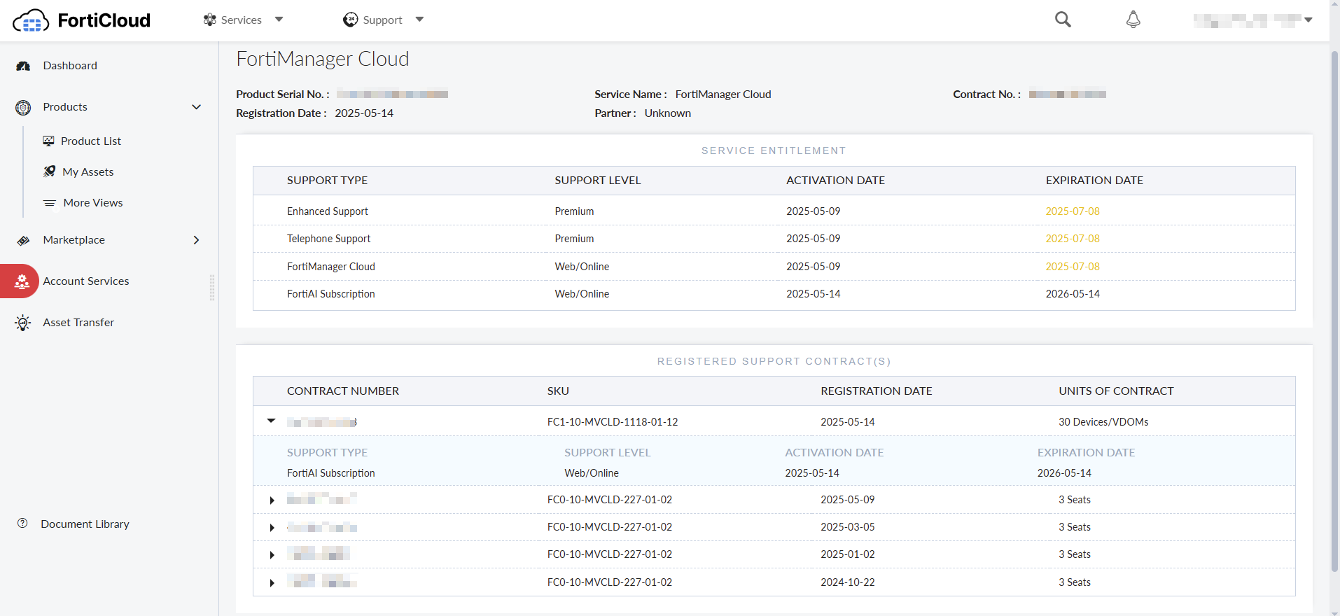 After registration is complete, the FortiAI subscription can be found as a registered support contract within the FortiManager Cloud asset in FortiCloud.