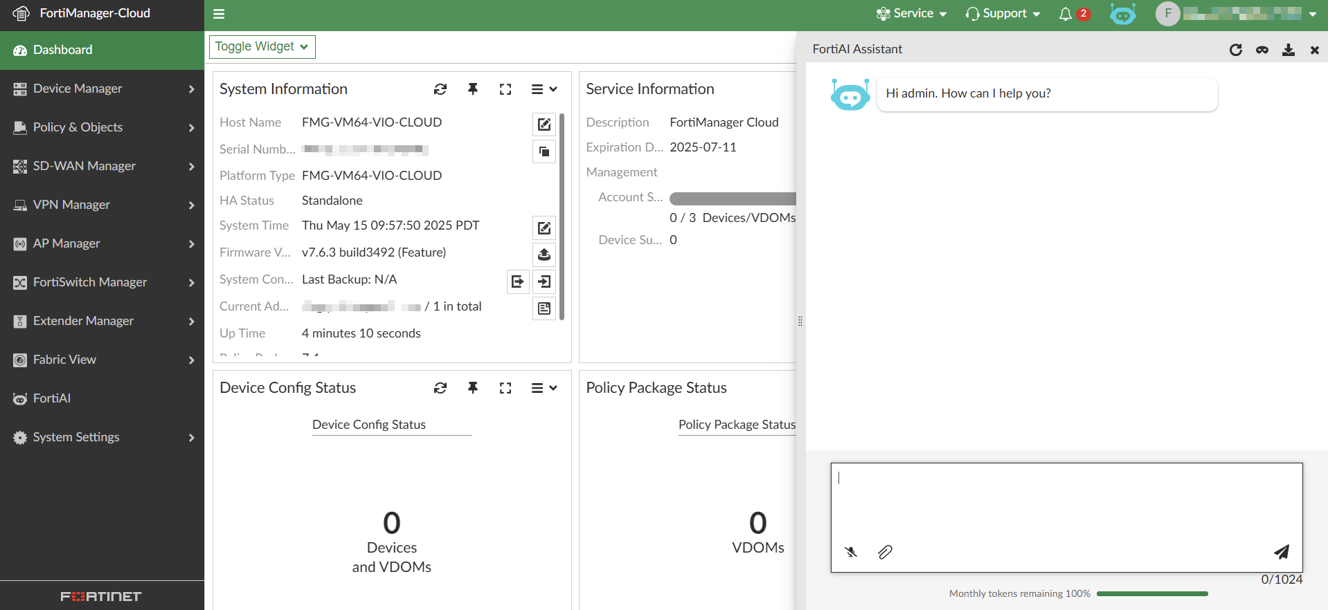 2. Go to FortiManager Cloud and enable the FortiAI service.