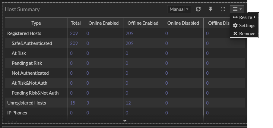 The right hand corner of the widget contains a widget menu that contains options to resize, modify settings, and remove the widget.