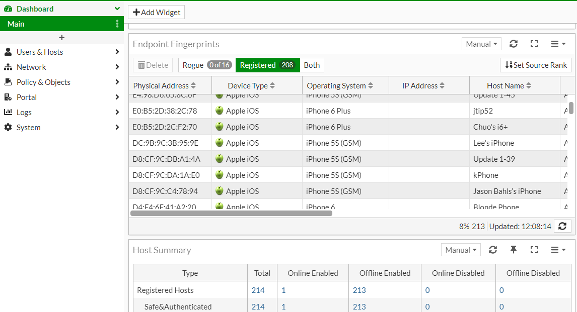 The FortiNAC dashboard plays an essential role in gaining visibility upon all the devices connected to your network. Because some IT professionals may have very large numbers of devices, the dashboard is essential for gaining a "lay of the land" view of all network activity. You can choose which widgets are displayed and rearrange their order.