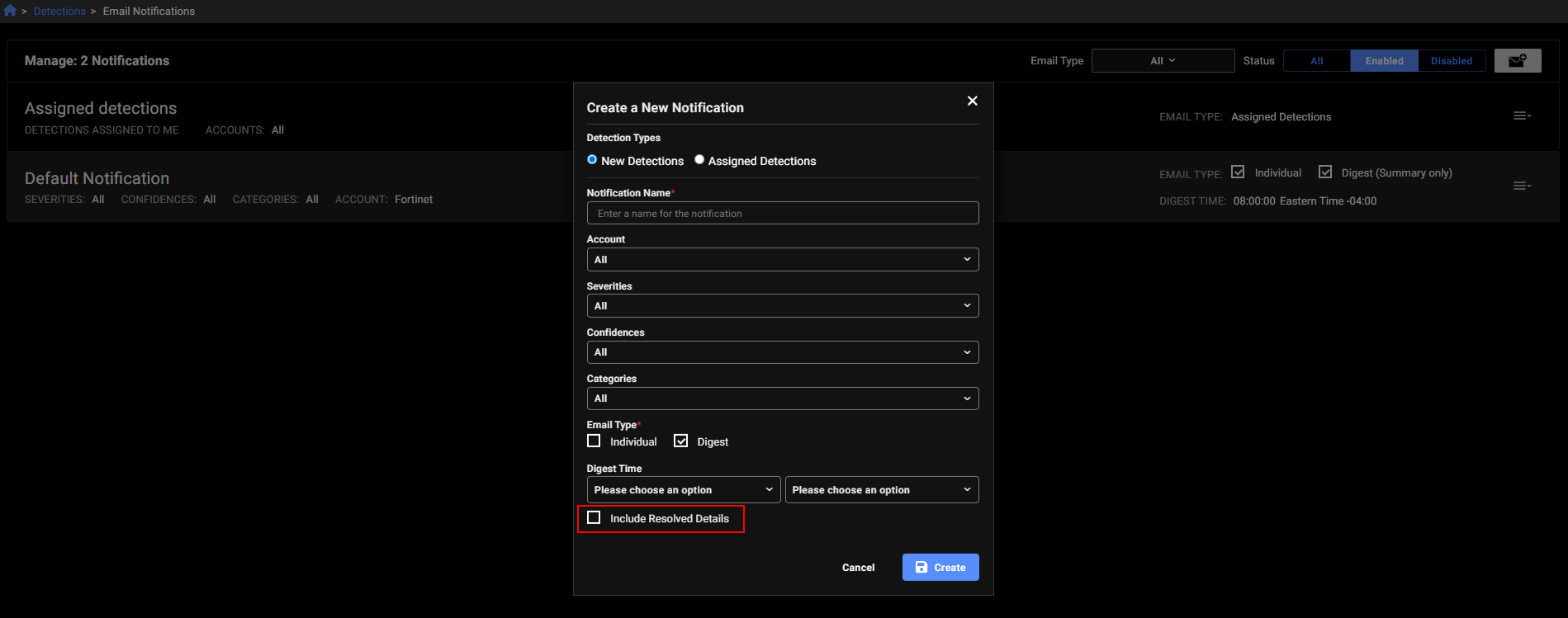 The Email Notifications page will display Digest with Resolve Details next to the email when this feature is enabled. This feature is in limited availability. If you would like it enabled please contact your TSM.