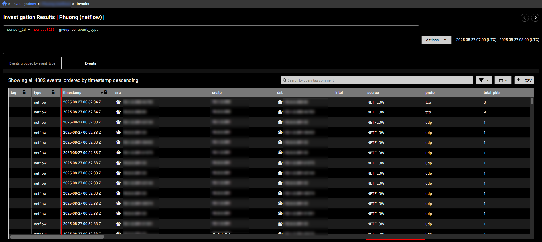 NetFlow event types are now supported in investigations. NetFlow traffic is processed using source and destination objects. The Entity Panel continues to treat this traffic as sensor data. If incoming NetFlow matches your sensor’s configuration, it will be displayed accordingly.