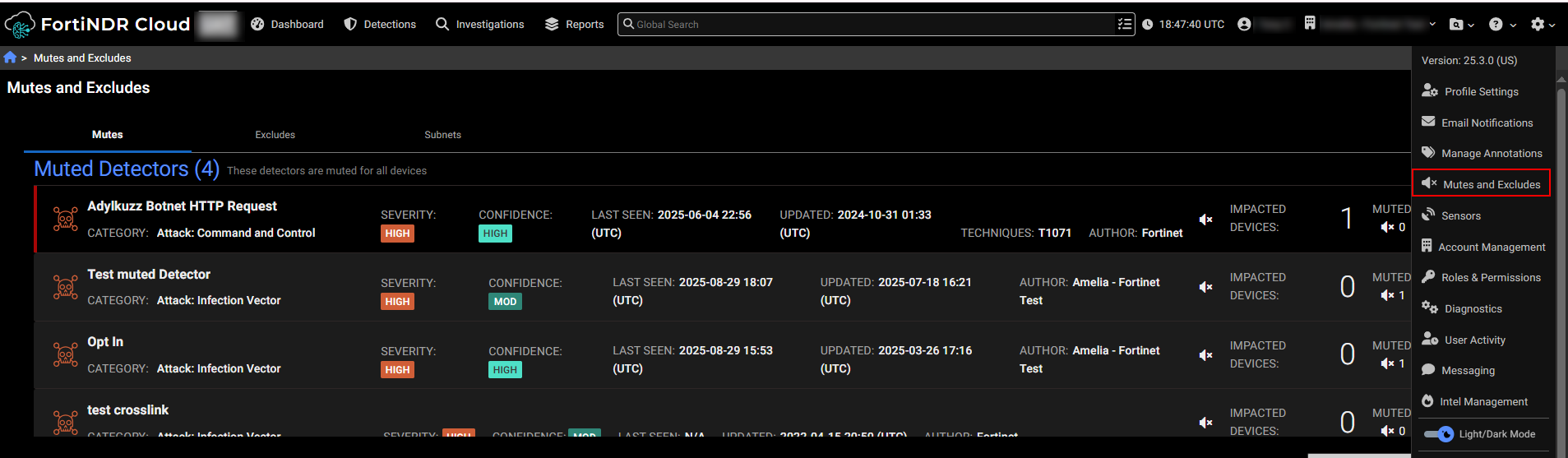 A new Mutes and Excludes page has been added to the main settings menu. This page summarizes all muted and excluded devices, including device-level mutes for detectors. It contains three tabs: Mutes, Excludes and Subnets.