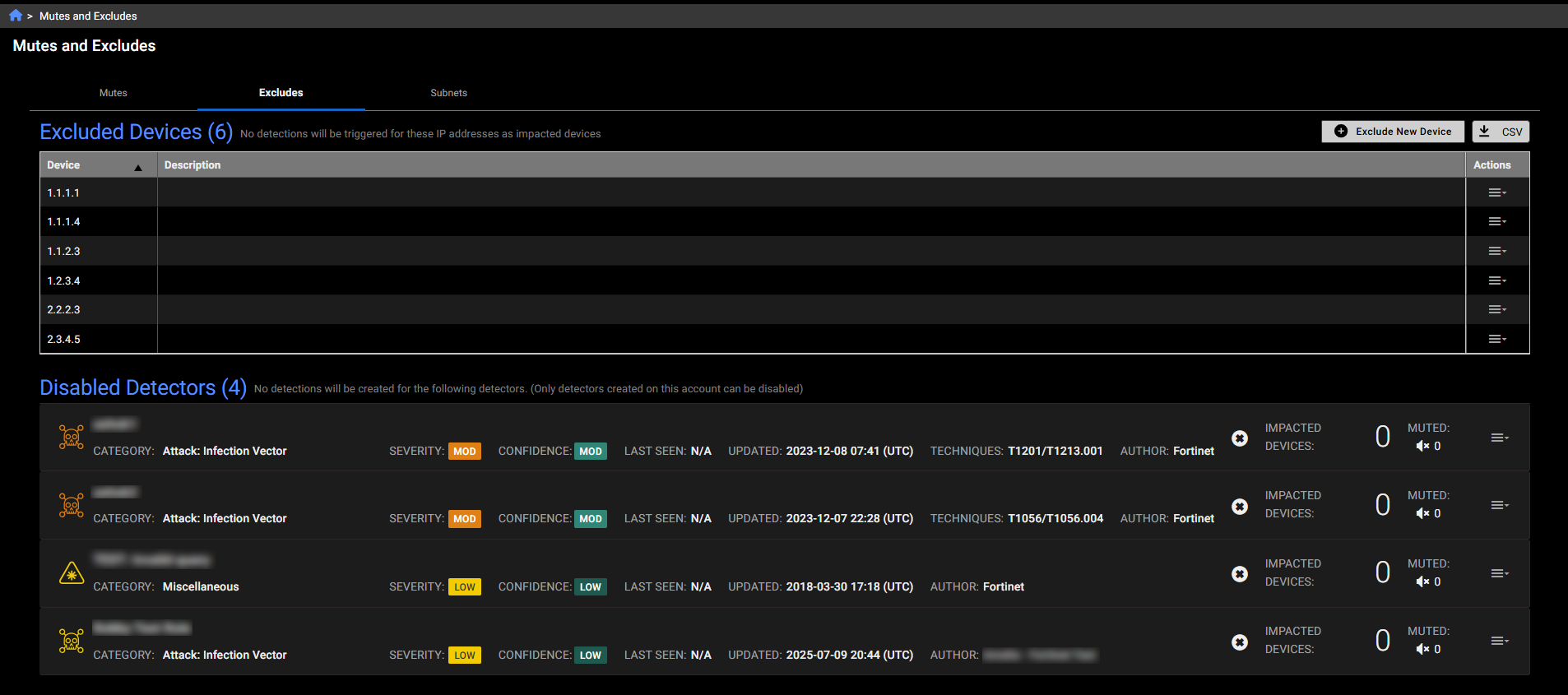 This tab shows devices that are excluded at the account level, meaning no detections will be triggered for them. It also includes disabled detectors.
