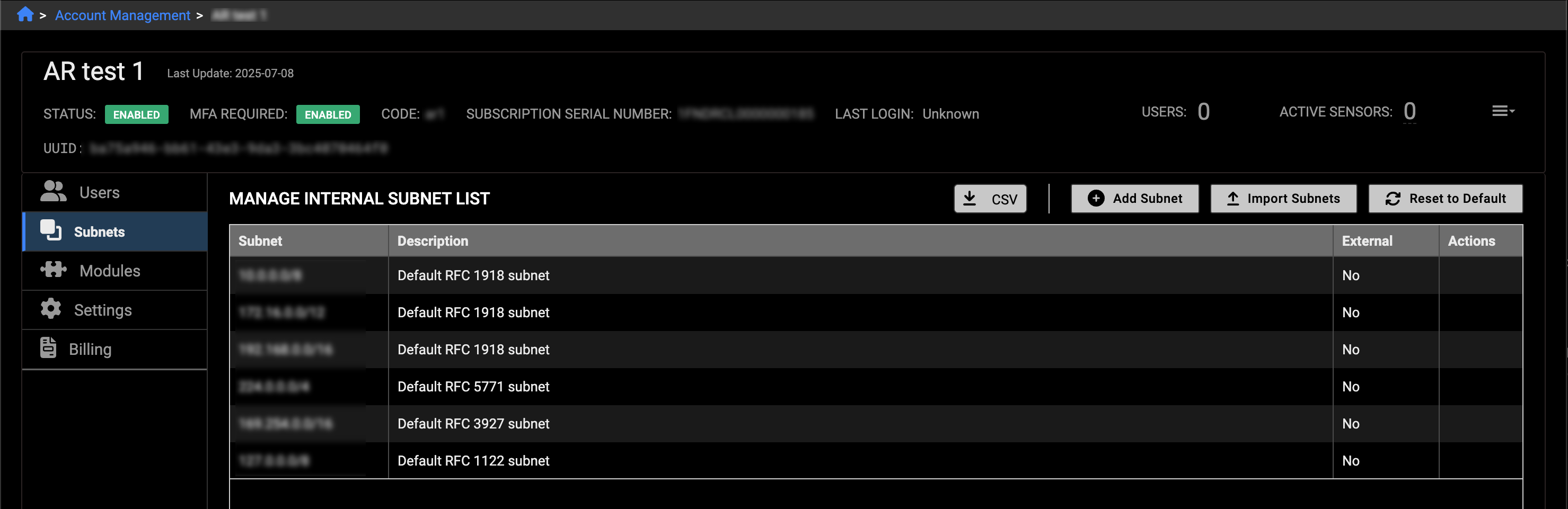 We have added a new Import Subnets button to the Account Management > Subnets tab. This allows you to upload thousands of subnets at once and delete them in bulk. Click the CSV button to download the current subnets, then add or remove entries and re-upload the file. You can also click the Reset to Default button to delete all subnets except the default.
