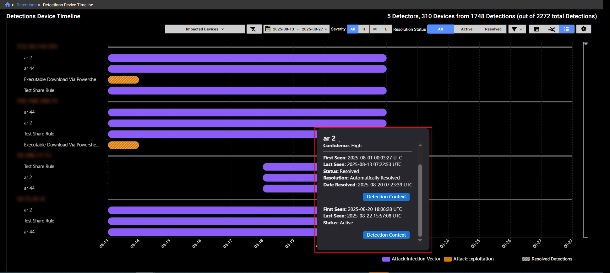 We have added a new view called Detections Device Timeline to Detections. This view shows all detections sorted by the device risk score.