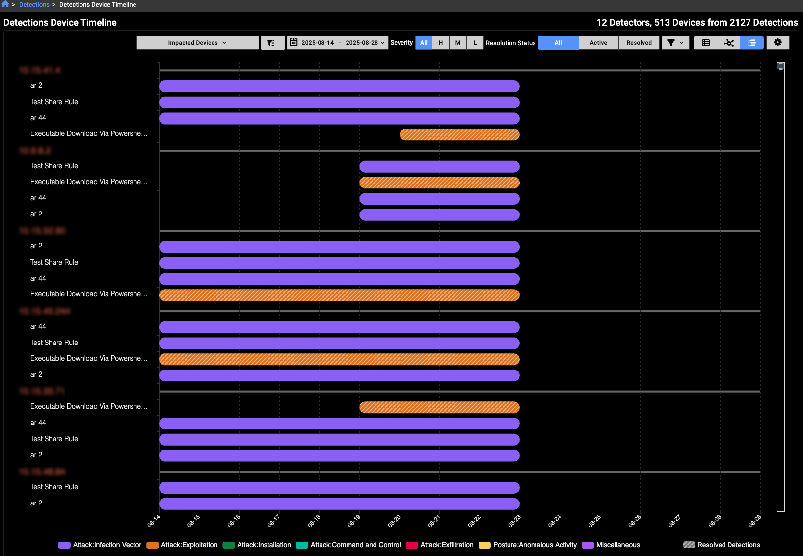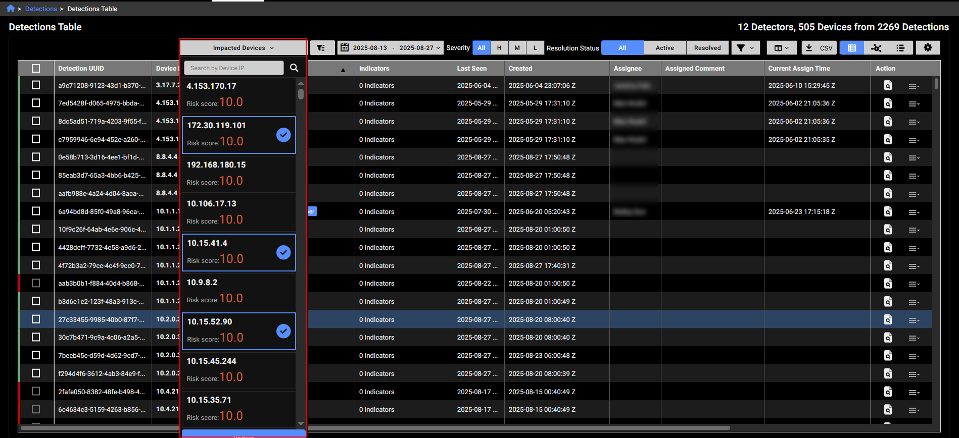 We have replaced the Device IP search box with a new filter called Impacted Devices in the Detections Table, Detections Visualizer and Detection Device Timeline. The IPs in the list are sorted by Risk Score. You can filter IPs with the search box and select the devices you want to include in the view.