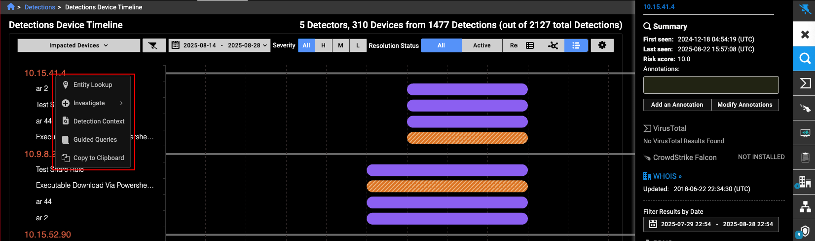 The Detections Device Timeline is available as a dedicated dashboard widget. By default, it displays the top five IPs with the highest risk scores from the past seven days. These settings are customizable.