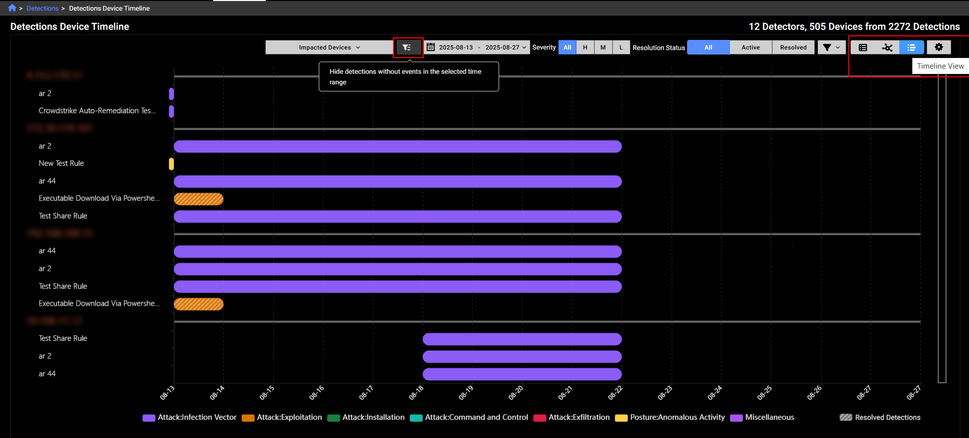 You can filter the view to hide detections that have no associated events during the selected time range. Use the toggles on the right side of the page to switch between the Detections Table and Detections Visualizer views. Both views also support the Detections Device Timeline toggle.