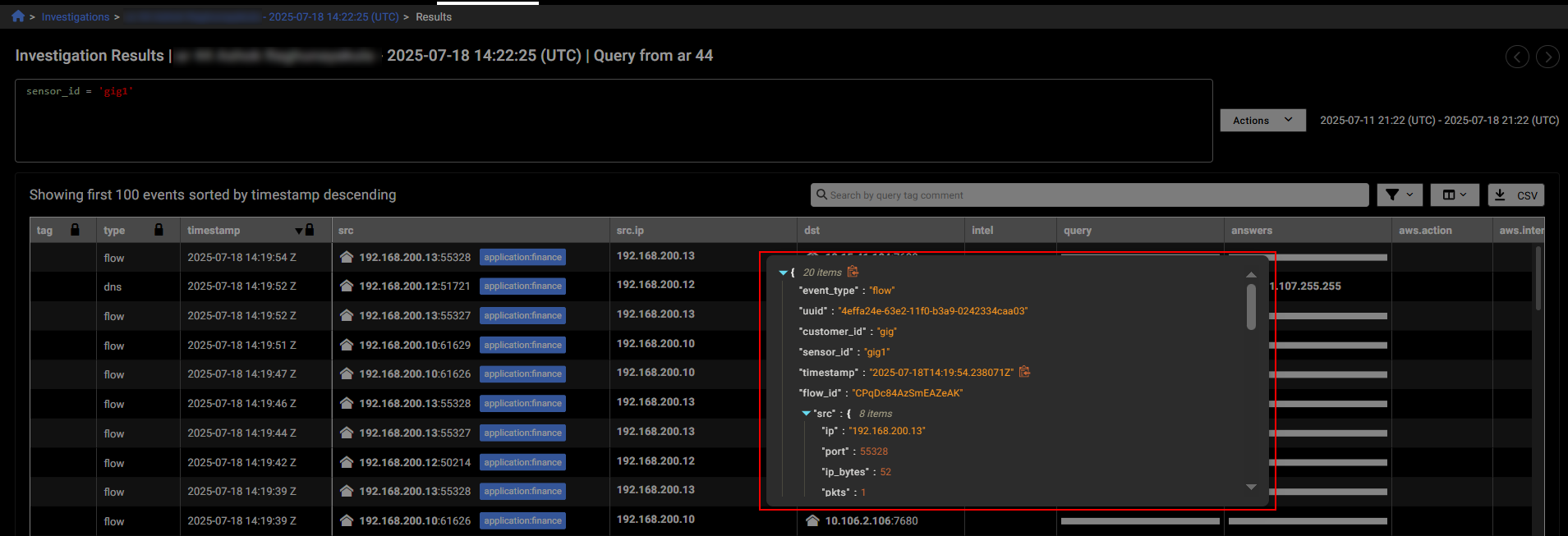 You can now view all details for a single event by double-clicking a blank area within the event row. This opens a pop-up displaying the full row data in JSON format. To copy the JSON, click the copy icon next to the first line. This feature saves time by eliminating the need to scroll through individual cells in the investigation results table.