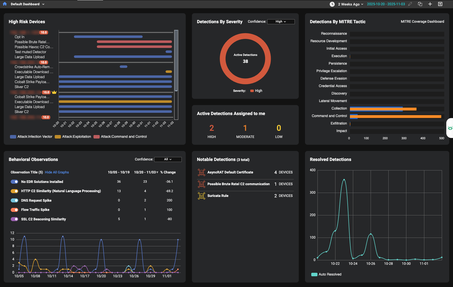 - The Detections by MITRE Tactic and Resolved Detections widgets now features redesigned visualizations for improved clarity.