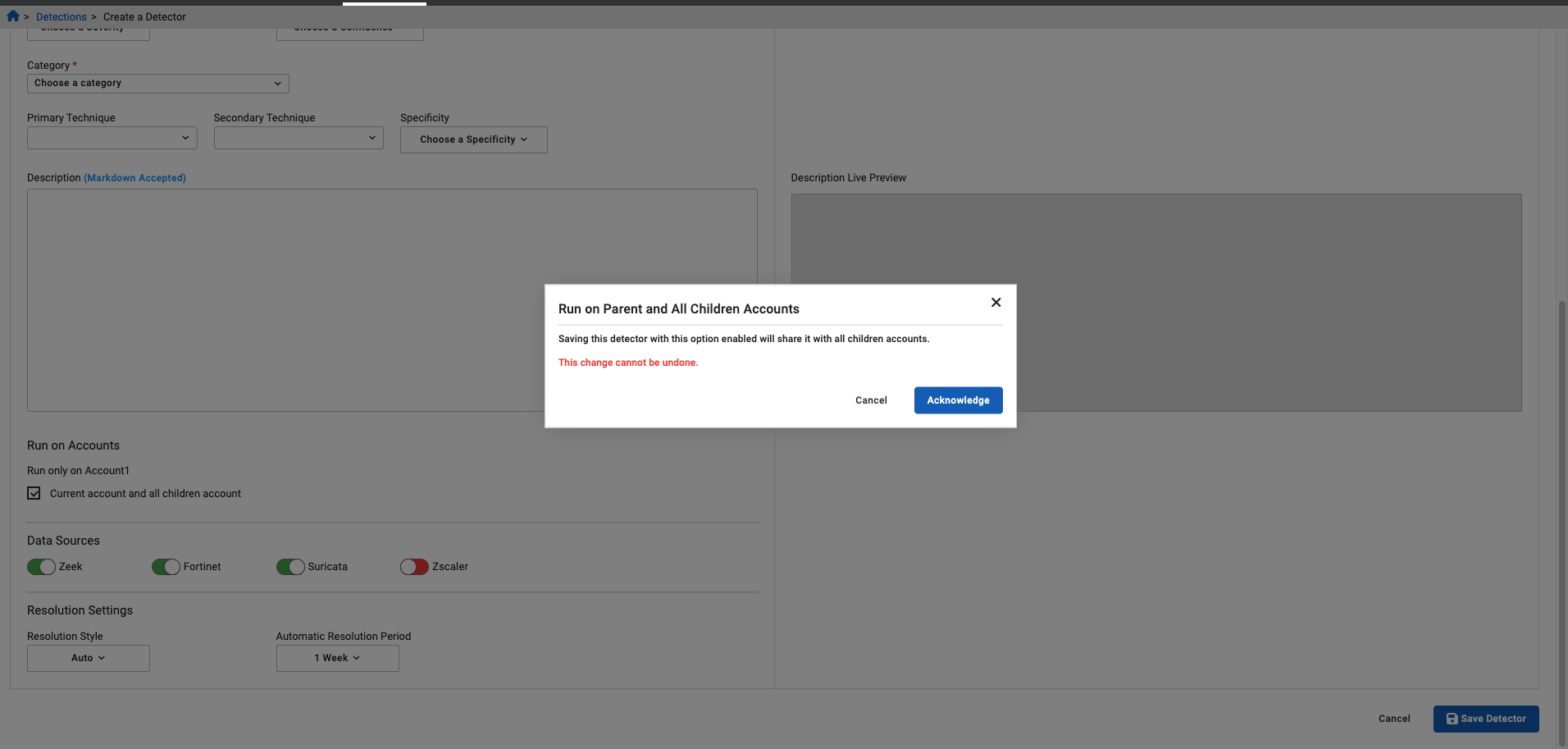 When creating a detector on a parent account, you have the option to run the detector on the current account and child accounts by enabling the Current account and all children account option. Note that this cannot be undone.