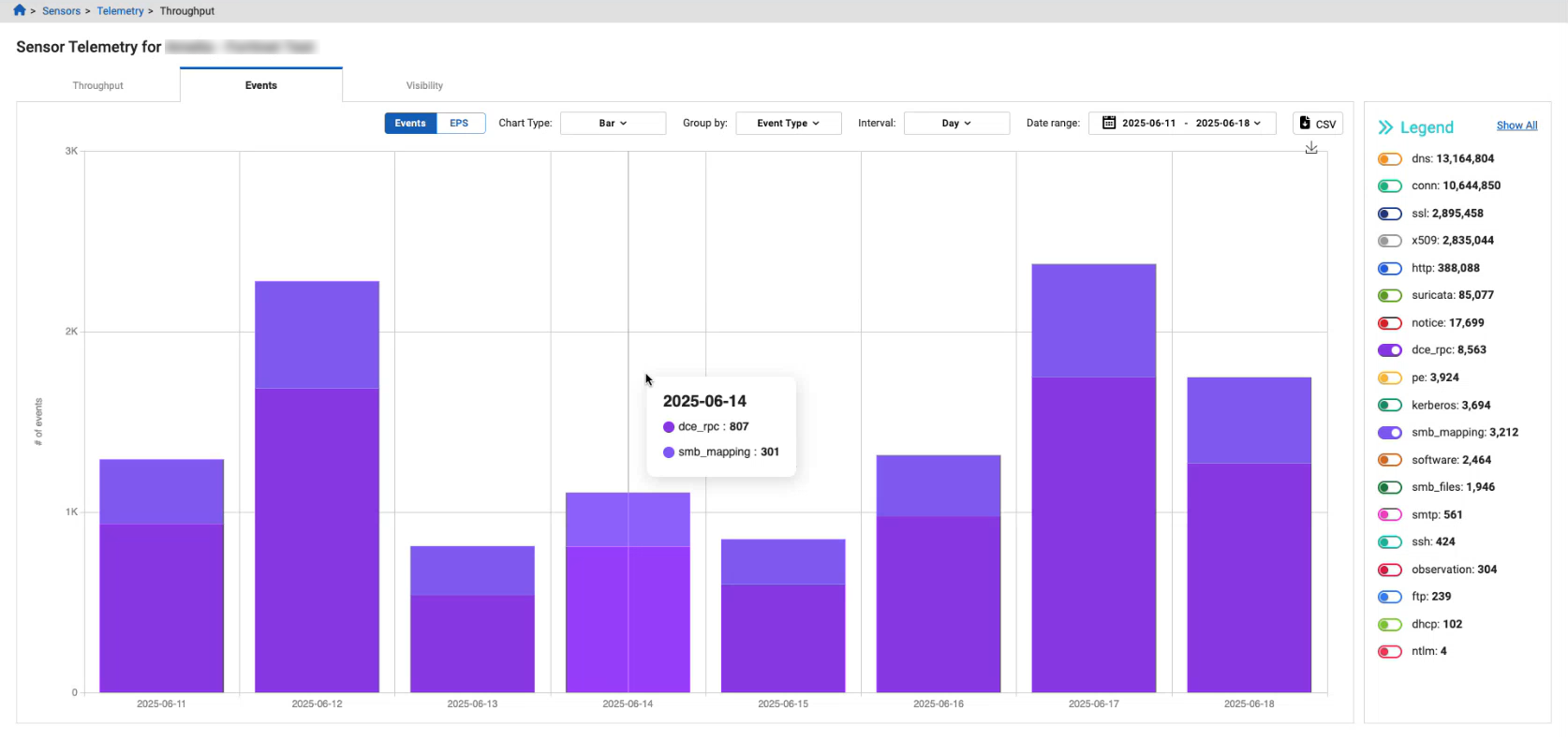 The legend has multiple colors to make it easy to differentiate between the event types, and the event types stay in the same order when switching between Events and EPS views.