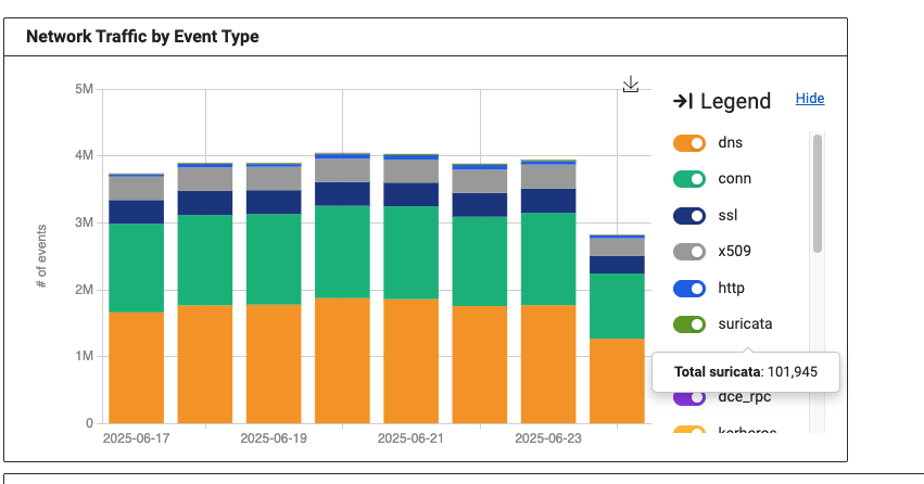 The Network Traffic by Event Type widget includes a selectable legend with multiple colors to make it easy to differentiate between the event types.