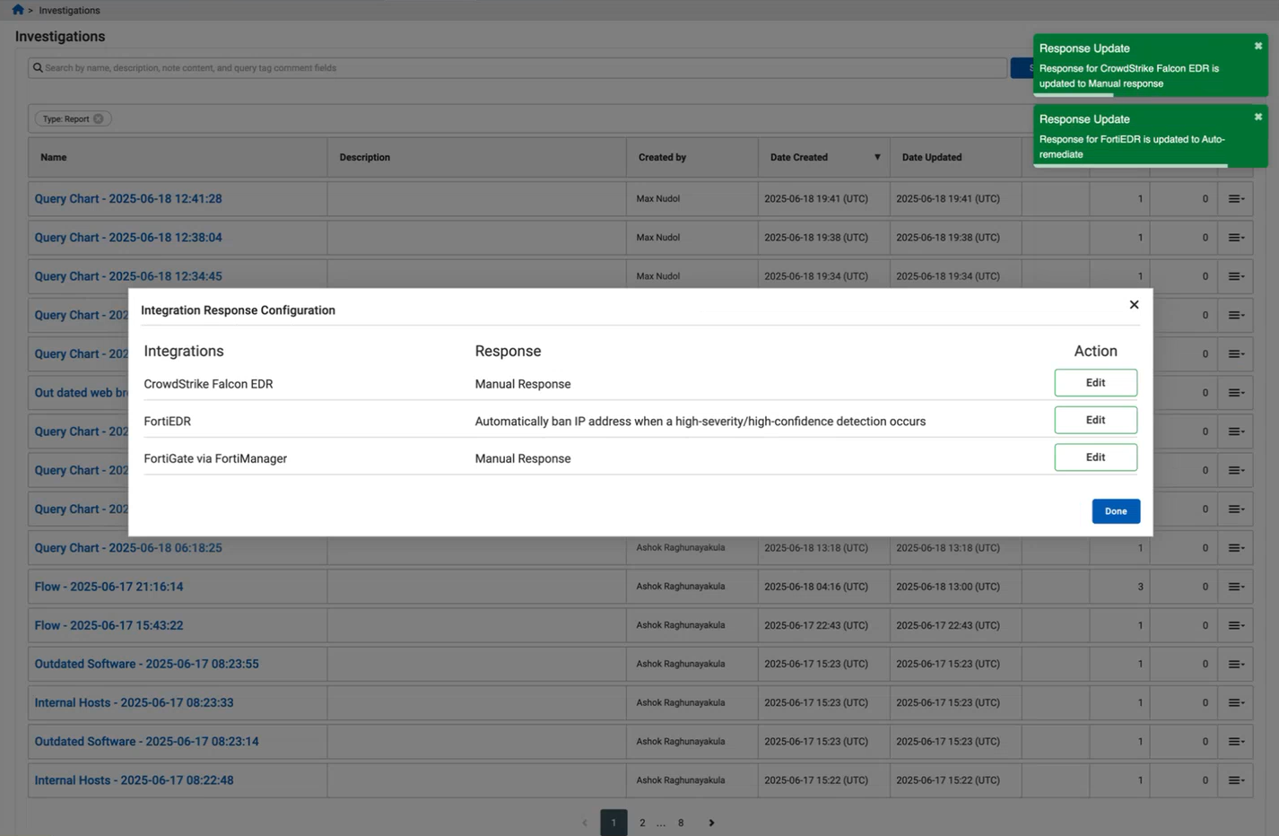 Automated integration response modules are added for FortiEDR and CrowdStrike Falcon EDR. Only a single integration can be set to Auto-Remediate at a time; others may be configured, but must be set up to respond manually.