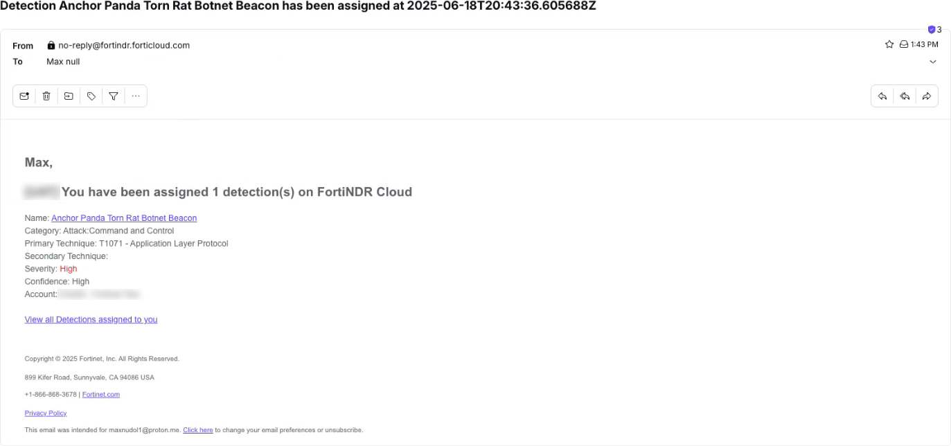 When a detection is assigned to you, or you assign one to yourself, you receive an email to let you know that the detection has been assigned.