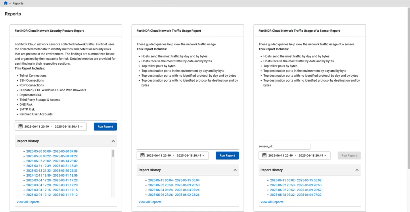 Two new reports are added for network traffic usage of an account and network traffic usage of a specific sensor over the past billing cycle (by default).