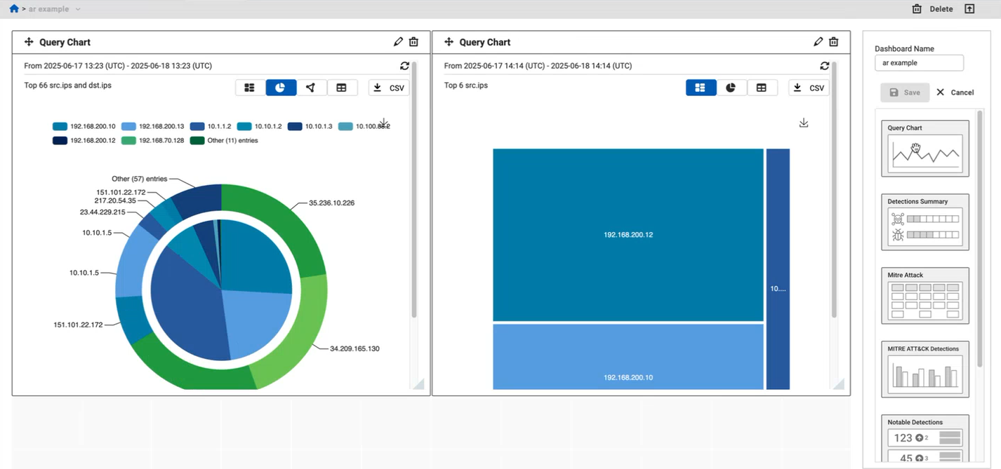 A Query Chart widget can be added to the dashboard. Saved group by queries from the investigations can be added to the widget, the time range can be selected, and the widget can be given a custom Name. Different types of charts or a table can be selected to display the data, and a CSV file can be downloaded. The refresh button must be clicked to refresh the data.