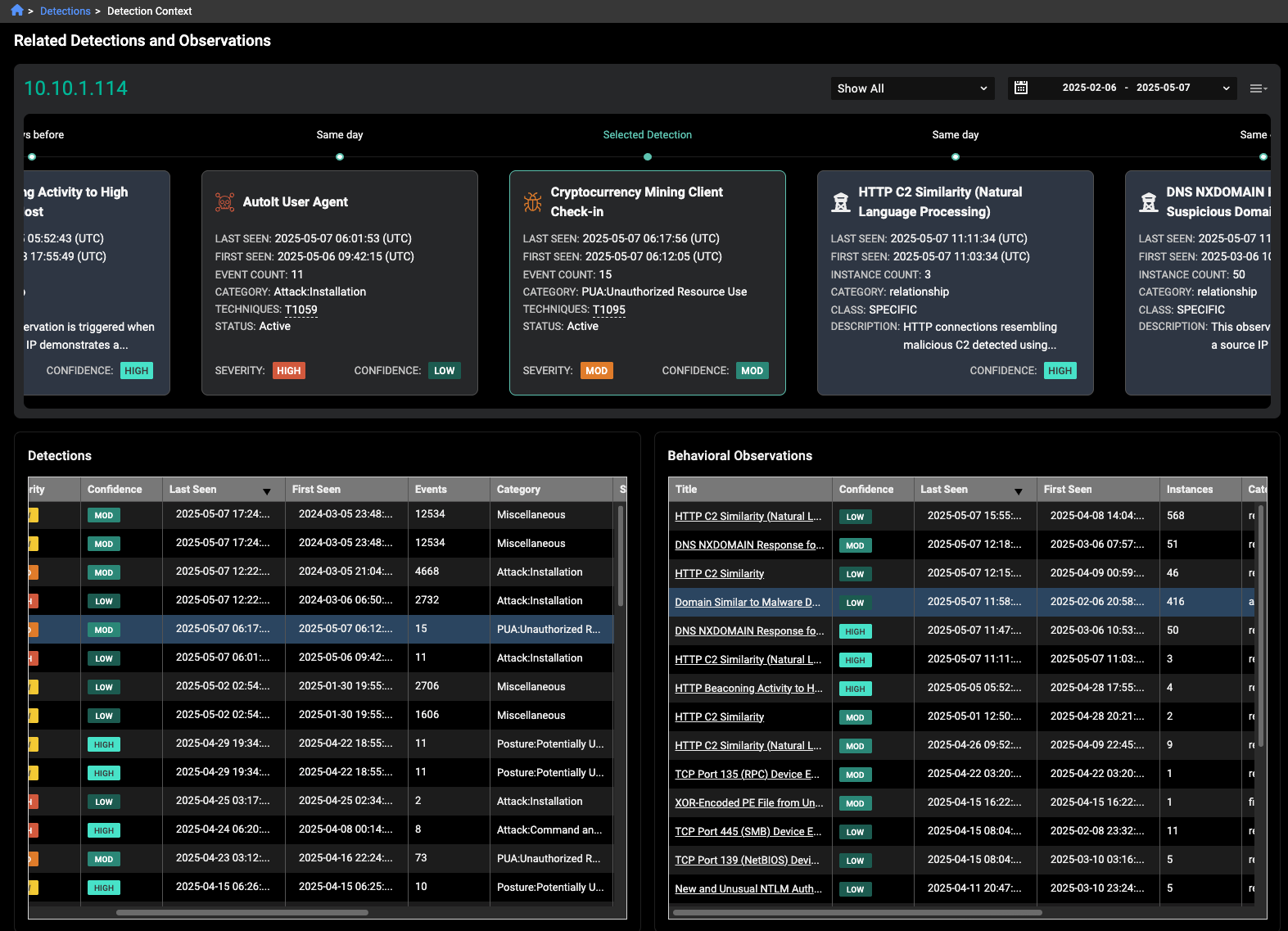 The Detection Context page displays the detections and observations timeline, as well as Detections and Behavioral Observations tables. The tables are sorted by Last Seen in descending order.