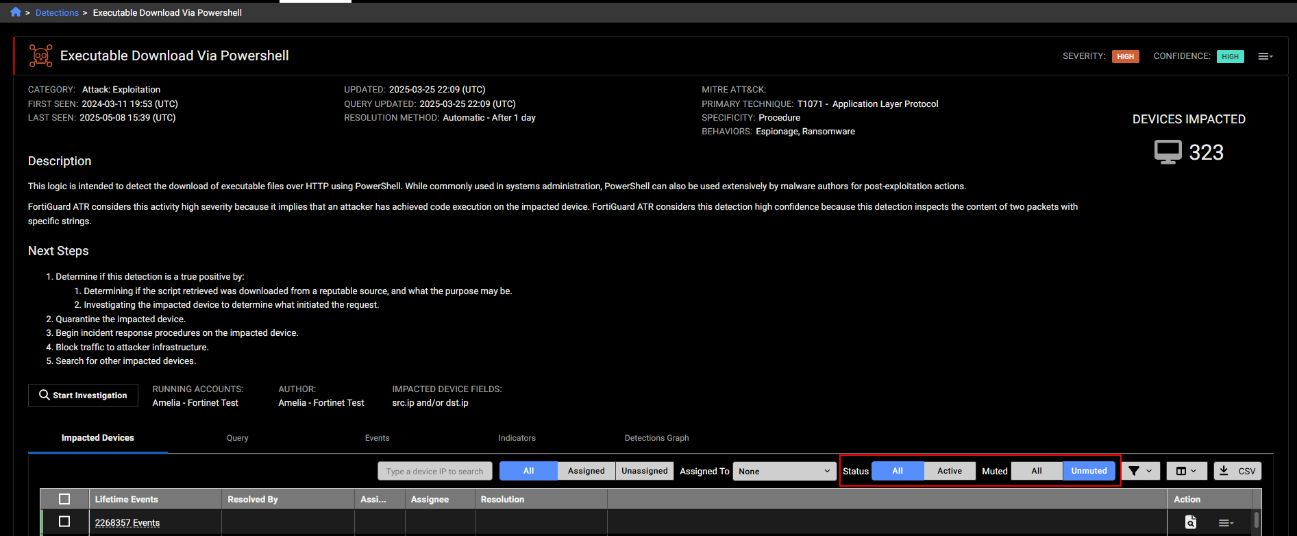 When you click a detection in the timeline, you are pivoted the Triage Detections details page. This page has been updated to include the Status and Muted filters. By default, the page shows All detections and Unmuted detections.