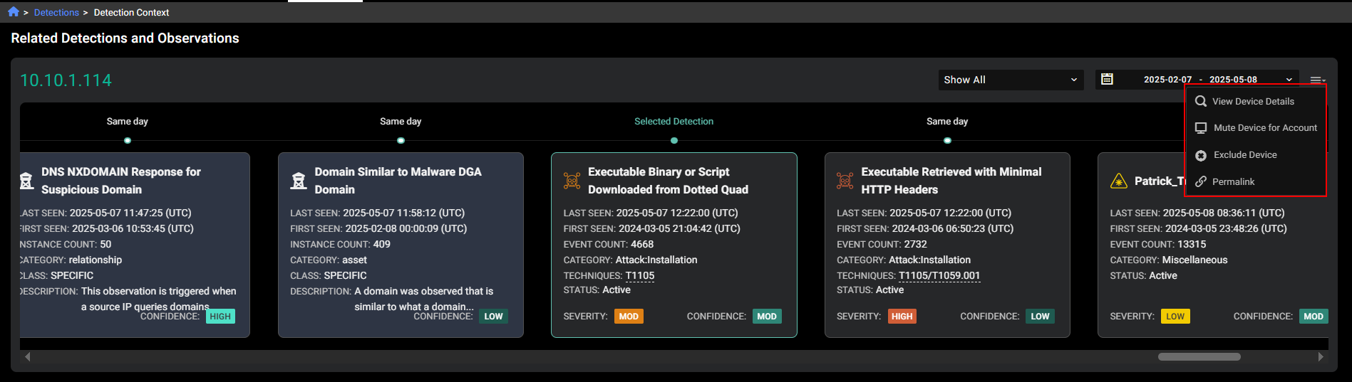 You can use the Detection Context page to view the device details, mute or exclude the device.